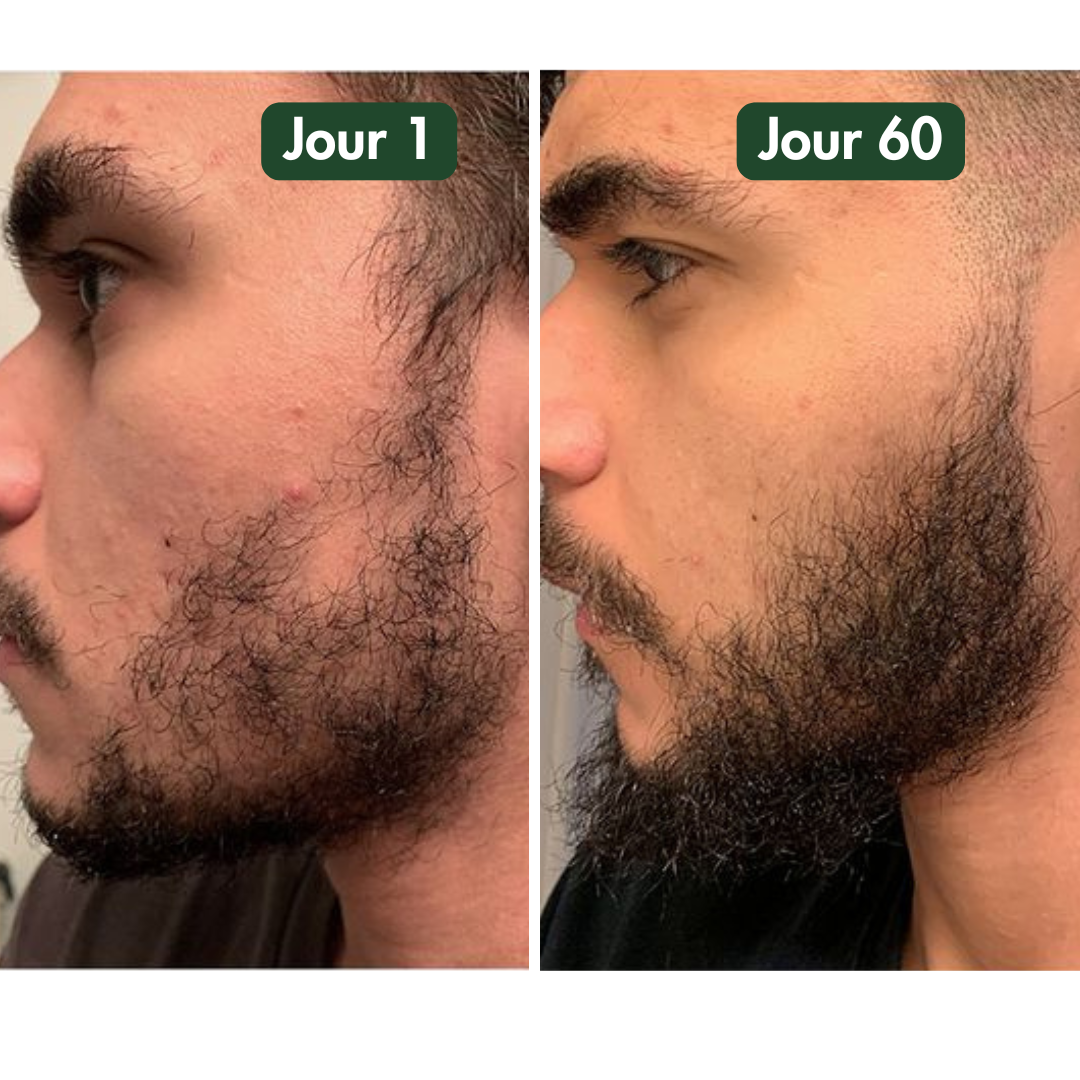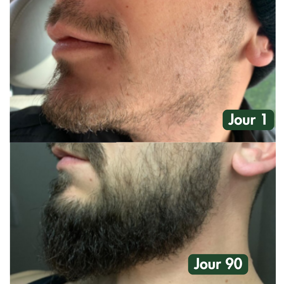 Les premiers signes d’évolution apparaissent généralement dès 4 à 6 semaines avec une utilisation quotidienne. Après 180 jours, durée de vie moyenne d’un flacon, la barbe gagne en densité, épaisseur et montre des signes clairs de croissance active.